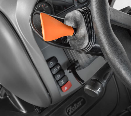 The P100PS Series tractors are equipped with Zetor Semi-Powershift transmission and a hydraulic Power Shuttle reverser. The transmission features four synchronized gears and three powershift gears that can be set on auto shifting mode or manual mode (by buttons on the side of gear shift lever). Plus there are two ranges, for a total of 24F / 24R speeds. A De-Clutch feature with a button on the front side of the shift knob activates the PowerClutch, which enables the operator to shift through the four gears without the need to depress the clutch pedal. The Power Shuttle Reverser control lever on the PS series is mounted to the steering column on the left side of dash. The SS models are equipped with a 19 MPH axle without front brakes.