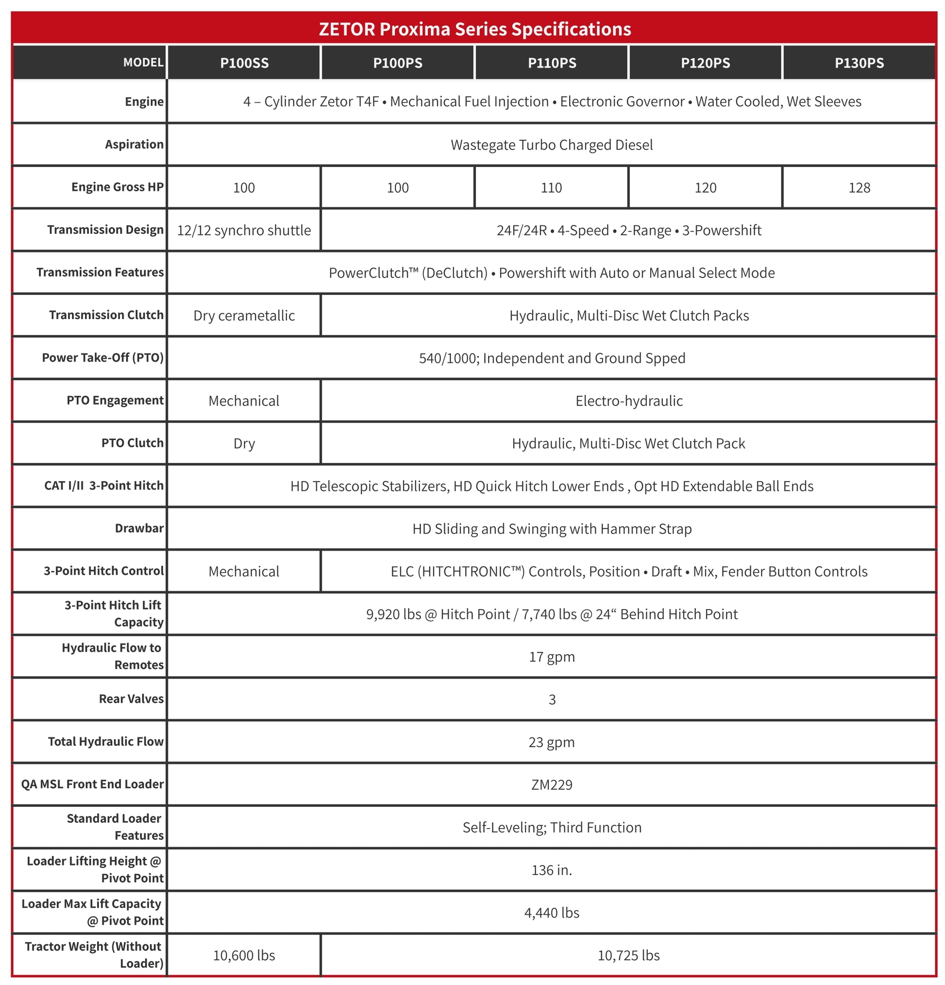 - P100 PS through P130 PS (99 to 128 HP) with Power Shuttle.